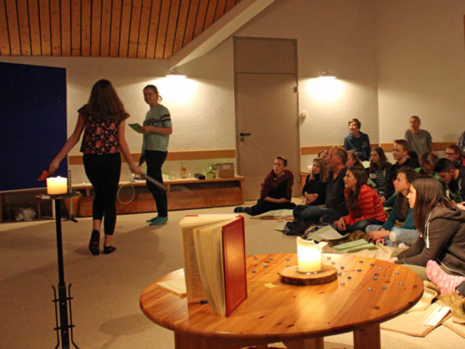Das zentrale Ereignis ist ein Gottesdienst zu dem sich alle viel Zeit nehmen. Jeder und jede kann sich dabei aktiv einbringen. Doch trotz aller Vorbereitung und Mühe geht es da nicht darum etwas „aufzuführen“. Diese Feier ist der spirituelle Mittelpunkt des Workshops. Impulse und Meditationen an besonderen Orten in der Oase begleiten die Teilnehmer durch die Tage, Zeiten der Ruhe geben Kraft für die Aktion.
